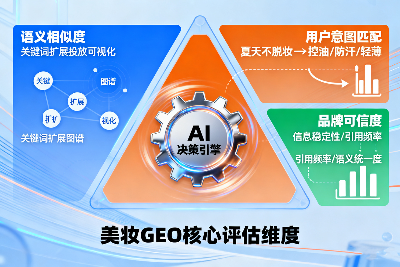 美妆行业长期以来以“视觉内容”为核心。高清妆效图、达人测评视频、电商详情页图文,构成了品牌传播与消费者认知的主要载体。然而,在AI搜索与生成式引擎优化(GEO优化)快速兴起的当下,这种以感官为中心的逻辑正在被“语义理解”取代。生成式AI并不会“看图选妆”,它依赖的是内容的语义结构、逻辑关联与可解释性。当用户搜索“适合干皮的粉底液推荐”时,AI生成的答案会综合多个品牌、功效与成分,而不是返回传统的网页列表。能否被这段回答引用,取决于内容是否满足AI的三个核心判断维度: