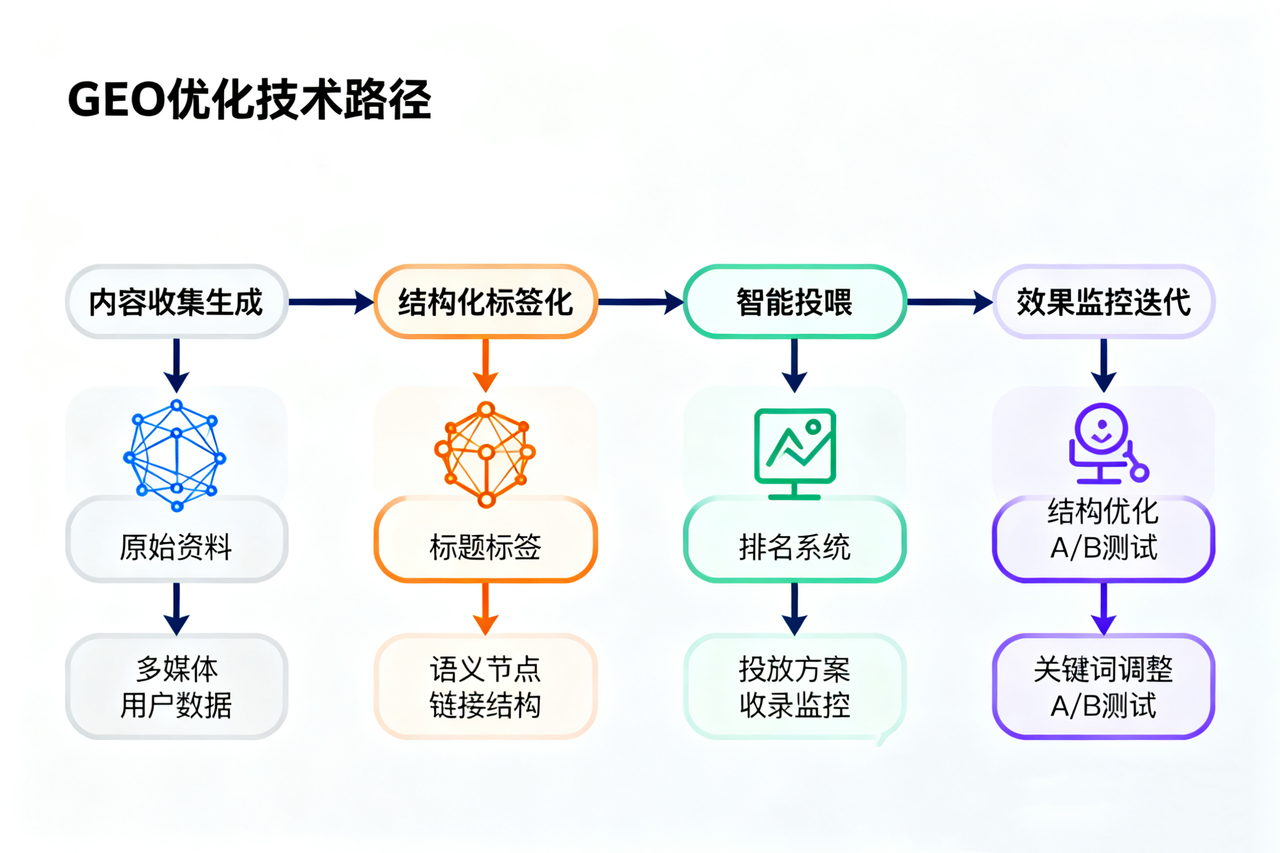 GEO优化是企业在AI搜索时代提升内容曝光与排名的系统工程,其技术路径可以分为内容生成、结构化、投喂、智能优化和效果监控几个环节。