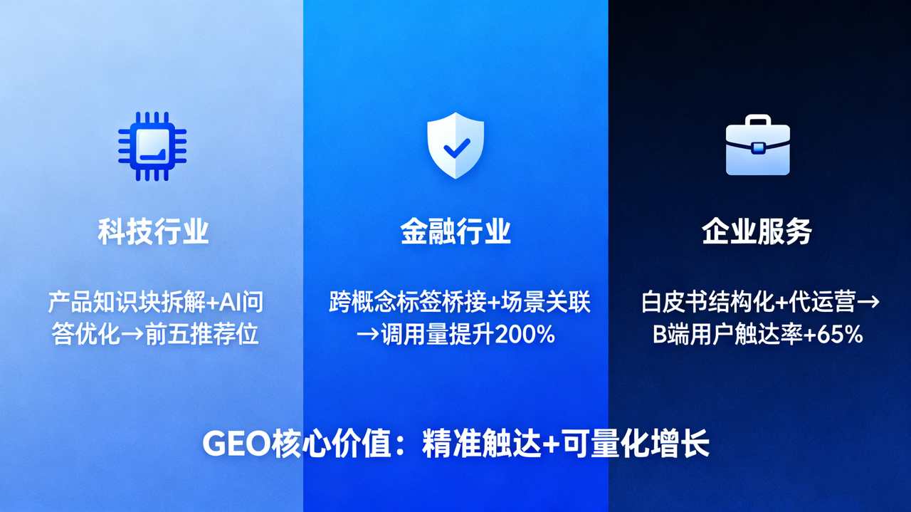 GEO在不同行业的落地实践显示了其跨行业的适用性和价值。旅游、金融、科技及企业服务等领域,都通过系统化的GEO策略获得了显著效果。