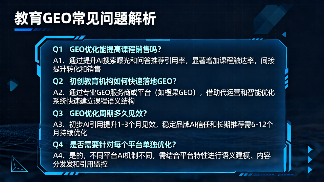 A1:通过提升AI搜索曝光和问答推荐引用率,GEO优化可以显著增加课程触达率,从而间接提升转化和销售。