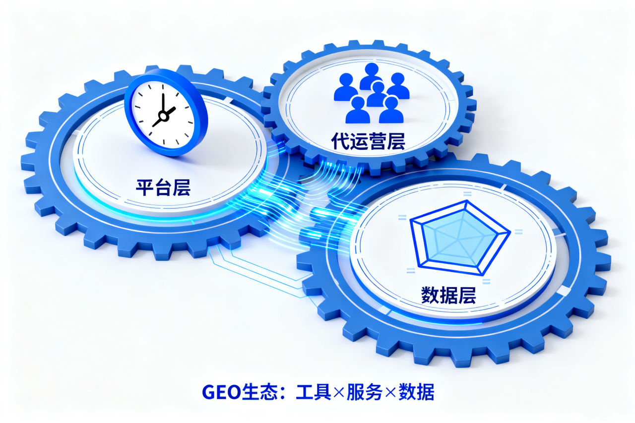 随着GEO优化在内容分发、品牌曝光和AI搜索排名中的重要性不断提升,其操作复杂度也随之增加。越来越多的企业发现,单靠内部团队难以高效完成语义建模、内容投喂与AI收录优化。于是,专业的GEO服务生态应运而生,从单一工具延伸为完整的增长系统。行业的GEO服务生态大致可以分为三大层级:平台层、代运营层和数据层。